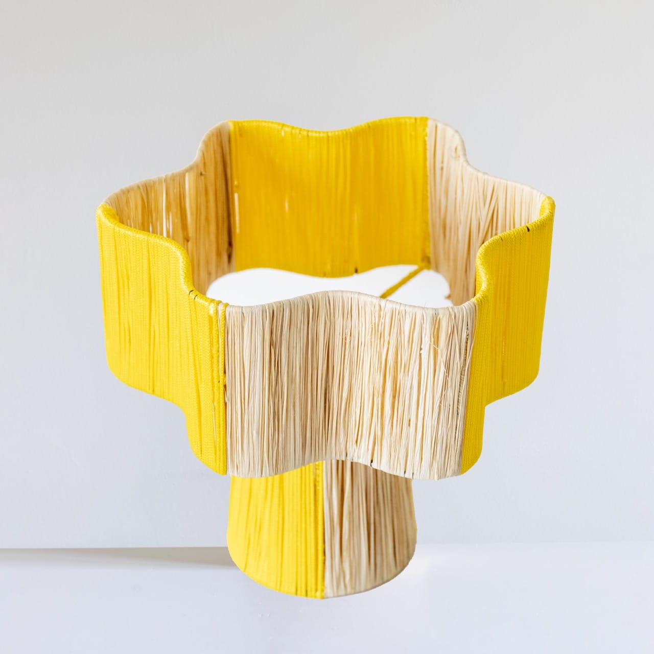 Deze geel gekleurde tafellamp van raffia en touw straalt energie, warmte en vrolijkheid uit. De bloemvormige kap geeft de lamp een speels en organisch karakter, terwijl de combinatie met naturel raffia zorgt voor een natuurlijke basis. Het resultaat is een unieke lamp die direct leven brengt in de ruimte.