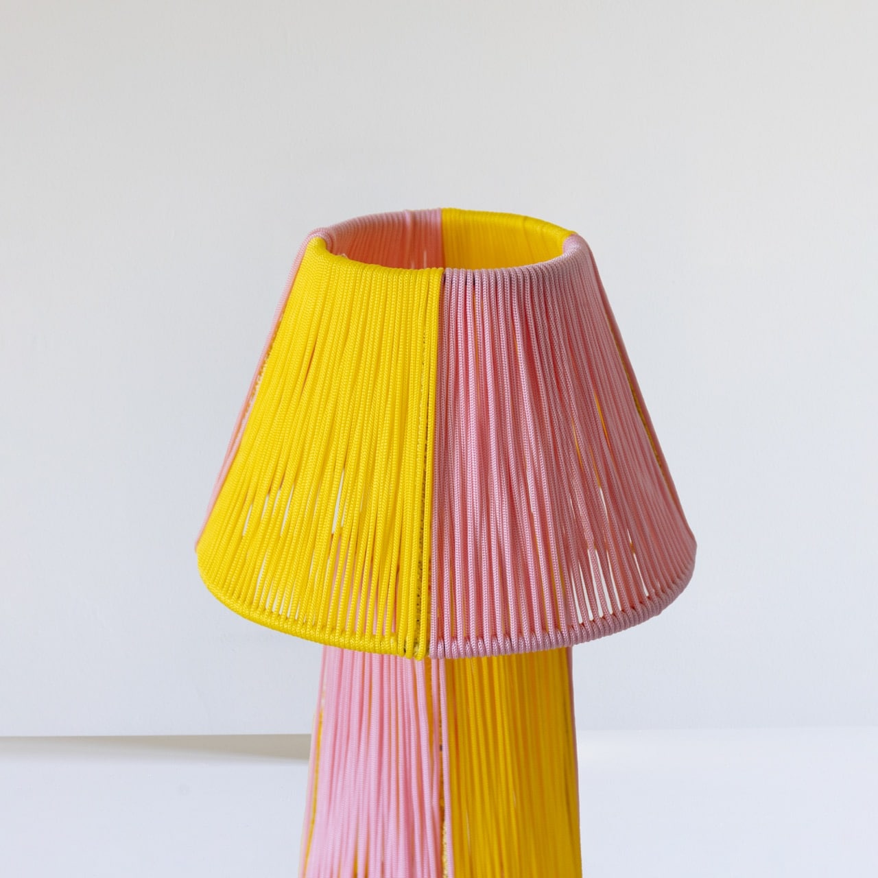 Deze tafellamp brengt kleur, warmte en karakter samen in één bijzonder ontwerp. Door het gebruik van strak gespannen touwdraad in een frisse combinatie van geel en roze ontstaat een speels lichtobject dat direct sfeer toevoegt aan elke ruimte. De kleuren zijn in duidelijke vlakken aangebracht en lopen door over zowel de voet als de kap, waardoor de lamp vanuit iedere hoek een andere uitstraling heeft. Wanneer het licht brandt, filteren de draden het licht op een zachte manier en zorgen ze voor een warme gloed met subtiele schaduwen op de omgeving.