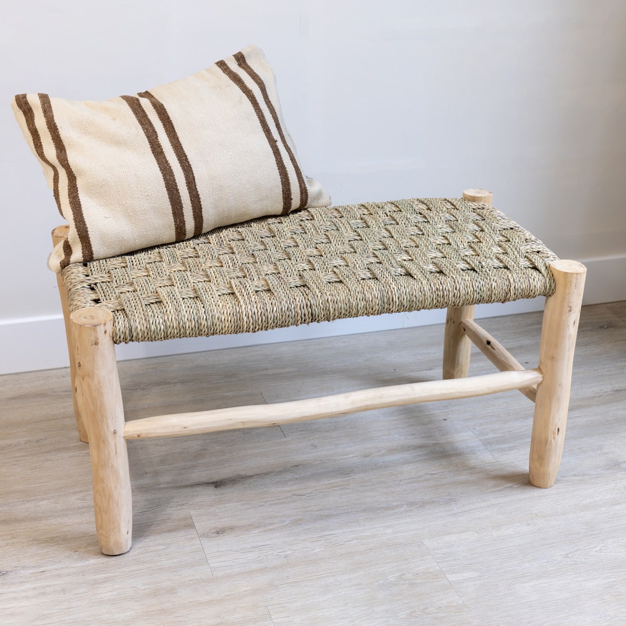 Breng een stukje authentiek Marokko in huis met dit met de hand vervaardigde bankje uit het hart van Marrakech. Elk exemplaar is volledig gemaakt van natuurlijk zeegras en massief eucalyptushout – zonder concessies, zonder kunststof, puur natuur.